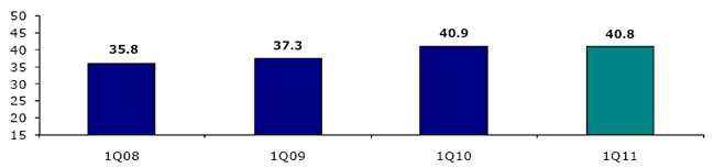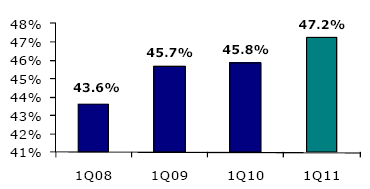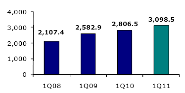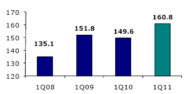 EBITDA, Operating Cash generation and Profit: Our Normalized EBITDA reached R$3,098.5 million in Q1 2011, an organic growth of +12.4%, while margin expanded 80 bps in the period to 47.2%. Cash generated from operations in Q1 was R$1,983.9 million, a 17.9% decrease as compared to same 2010 period. Our Normalized Profit was R$2,089.2 million (+21.7%), while our Normalized Earnings per share (EPS) grew 20.9%.