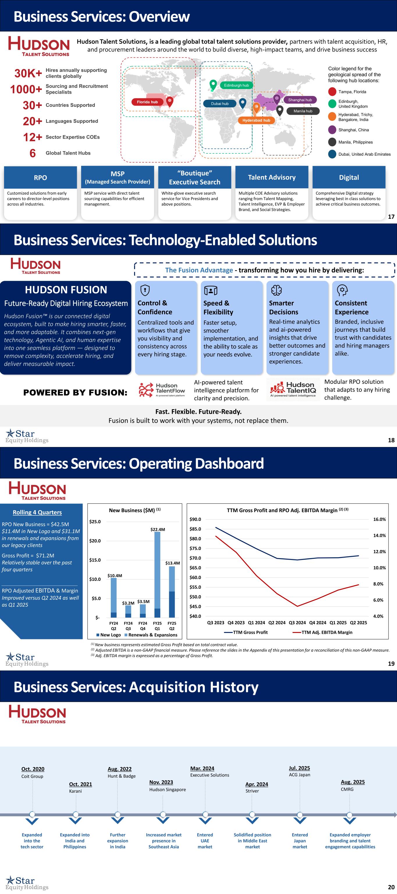 17 MSP service with direct talent sourcing capabilities for efficient management. White-glove executive search service for Vice Presidents and above positions. Multiple COE Advisory solutions ranging from Talent Mapping, Talent Intelligence, EVP & Employer Brand, and Social Strategies. Comprehensive Digital strategy leveraging best in class solutions to achieve critical business outcomes. Hudson Talent Solutions, is a leading global total talent solutions provider, partners with talent acquisition, HR, and procurement leaders around the world to build diverse, high-impact teams, and drive business success Customized solutions from early careers to director-level positions across all industries. RPO MSP (Managed Search Provider) “Boutique” Executive Search Talent Advisory Tampa, Florida Color legend for the geological spread of the following hub locations: Edinburgh, United Kingdom Hyderabad, Trichy, Bangalore, India Shanghai, China Manila, Philippines Dubai, United Arab Emirates Digital 1000+ Sourcing and Recruitment Specialists 20+ Languages Supported 12+ Sector Expertise COEs 6 Global Talent Hubs 30K+ Hires annually supporting clients globally 30+ Countries Supported Business Services: Overview 18 POWERED BY FUSION: Modular RPO solution that adapts to any hiring challenge. AI-powered talent intelligence platform for clarity and precision. Speed & Flexibility Faster setup, smoother implementation, and the ability to scale as your needs evolve. Consistent Experience Branded, inclusive journeys that build trust with candidates and hiring managers alike. Smarter Decisions Real-time analytics and ai-powered insights that drive better outcomes and stronger candidate experiences. Control & Confidence Centralized tools and workflows that give you visibility and consistency across every hiring stage. Fast. Flexible. Future-Ready. Fusion is built to work with your systems, not replace them. The Fusion Advantage - transforming how you hire by delivering: HUDSON FUSION Future-Ready Digital Hiring Ecosystem Hudson Fusion is our connected digital ecosystem, built to make hiring smarter, faster, and more adaptable. It combines next-gen technology, Agentic AI, and human expertise into one seamless platform — designed to remove complexity, accelerate hiring, and deliver measurable impact. Business Services: Technology-Enabled Solutions 19 RPO New Business = $42.5M $11.4M in New Logo and $31.1M in renewals and expansions from our legacy clients Gross Profit = $71.2M Relatively stable over the past four quarters RPO Adjusted EBITDA & Margin Improved versus Q2 2024 as well as Q1 2025 Rolling 4 Quarters (1) New business represents estimated Gross Profit based on total contract value. (2) Adjusted EBITDA is a non-GAAP financial measure. Please reference the slides in the Appendix of this presentation for a reconciliation of this non-GAAP measure. (3) Adj. EBITDA margin is expressed as a percentage of Gross Profit. $- $5.0 $10.0 $15.0 $20.0 $25.0 FY24 Q2 FY24 Q3 FY24 Q4 FY25 Q1 FY25 Q2 New Business ($M) (1) New Logo Renewals & Exensions $10.4M $3.2M $3.5M $22.4M $13.4M pansions 4.0% 6.0% 8.0% 10.0% 12.0% 14.0% 16.0% $40.0 $45.0 $50.0 $55.0 $60.0 $65.0 $70.0 $75.0 $80.0 $85.0 $90.0 Q3 2023 Q4 2023 Q1 2024 Q2 2024 Q3 2024 Q4 2024 Q1 2025 Q2 2025 TTM Gross Profit and RPO Adj. EBITDA Margin (2) (3) TTM Gross Profit Margin TTM Adj. EBITDA Margin Business Services: Operating Dashboard 20 ACG Japan Jul. 2025 Coit Group Oct. 2020 Karani Oct. 2021 Hunt & Badge Aug. 2022 Hudson Singapore Nov. 2023 Executive Solutions Mar. 2024 Striver Apr. 2024 CMRG Aug. 2025 Expanded into the tech sector Expanded into India and Philippines Further expansion in India Increased market presence in Southeast Asia Entered UAE market Solidified position in Middle East market Entered Japan market Expanded employer branding and talent engagement capabilities Business Services: Acquisition History