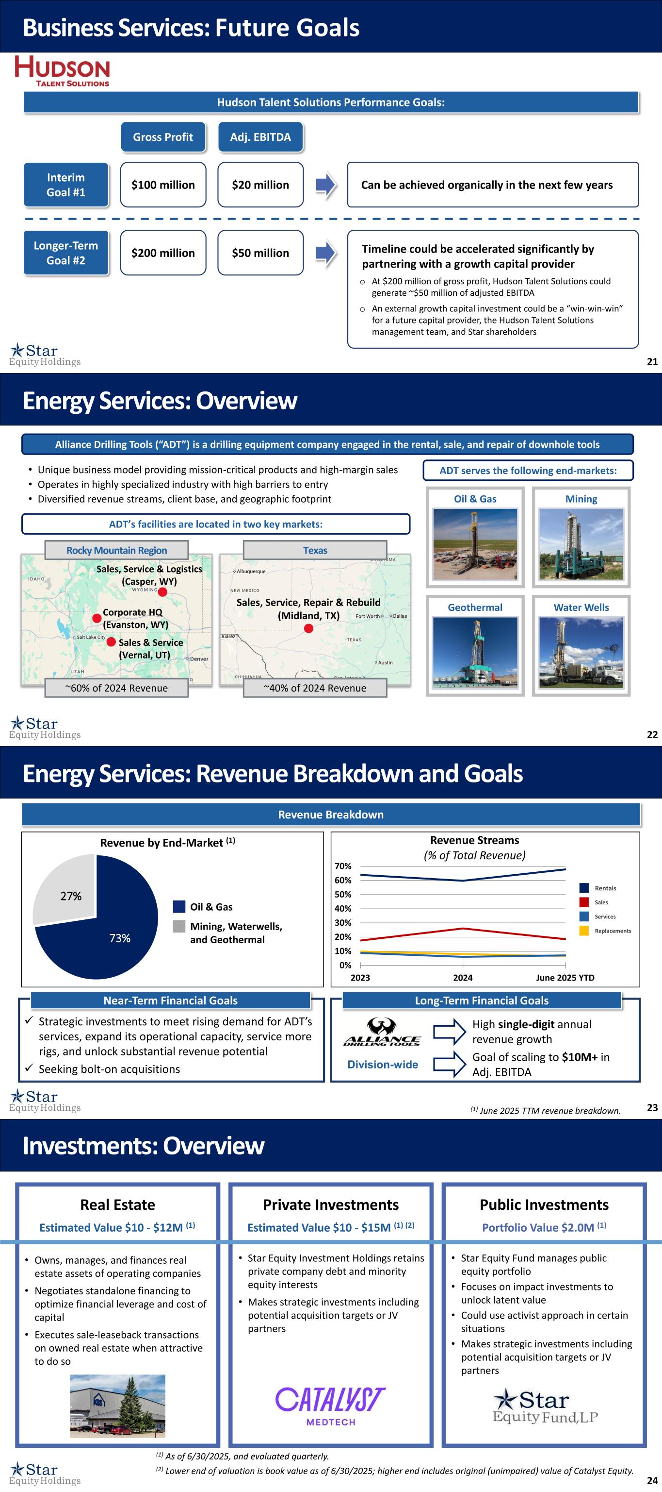 21 Interim Goal #1 Longer-Term Goal #2 $100 million $200 million $20 million $50 million Gross Profit Adj. EBITDA Hudson Talent Solutions Performance Goals: Can be achieved organically in the next few years Timeline could be accelerated significantly by partnering with a growth capital provider o At $200 million of gross profit, Hudson Talent Solutions could generate ~$50 million of adjusted EBITDA o An external growth capital investment could be a “win-win-win” for a future capital provider, the Hudson Talent Solutions management team, and Star shareholders Business Services: Future Goals 22 Alliance Drilling Tools (“ADT”) is a drilling equipment company engaged in the rental, sale, and repair of downhole tools Energy Services: Overview Sales, Service & Logistics (Casper, WY) ADT’s facilities are located in two key markets: Water Wells Mining Geothermal Oil & Gas Corporate HQ (Evanston, WY) Sales & Service (Vernal, UT) Rocky Mountain Region ~60% of 2024 Revenue Sales, Service, Repair & Rebuild (Midland, TX) Texas ~40% of 2024 Revenue ADT serves the following end-markets:• Unique business model providing mission-critical products and high-margin sales • Operates in highly specialized industry with high barriers to entry • Diversified revenue streams, client base, and geographic footprint 23 Revenue Breakdown Energy Services: Revenue Breakdown and Goals Rentals Sales Services Replacements 0% 10% 20% 30% 40% 50% 60% 70% 2023 2024 June 2025 YTD Revenue Streams (% of Total Revenue) (1) June 2025 TTM revenue breakdown. 73% 27% Oil & Gas Mining, Waterwells, and Geothermal Revenue by End-Market (1) Long-Term Financial Goals ✓ Strategic investments to meet rising demand for ADT’s services, expand its operational capacity, service more rigs, and unlock substantial revenue potential ✓ Seeking bolt-on acquisitions Near-Term Financial Goals Goal of scaling to $10M+ in Adj. EBITDA Division-wide High single-digit annual revenue growth 24 Private Investments • Star Equity Investment Holdings retains private company debt and minority equity interests • Makes strategic investments including potential acquisition targets or JV partners Investments: Overview Real Estate • Owns, manages, and finances real estate assets of operating companies • Negotiates standalone financing to optimize financial leverage and cost of capital • Executes sale-leaseback transactions on owned real estate when attractive to do so Public Investments • Star Equity Fund manages public equity portfolio • Focuses on impact investments to unlock latent value • Could use activist approach in certain situations • Makes strategic investments including potential acquisition targets or JV partners Estimated Value $10 - $12M (1) Estimated Value $10 - $15M (1) (2) Portfolio Value $2.0M (1) (1) As of 6/30/2025, and evaluated quarterly. (2) Lower end of valuation is book value as of 6/30/2025; higher end includes original (unimpaired) value of Catalyst Equity.