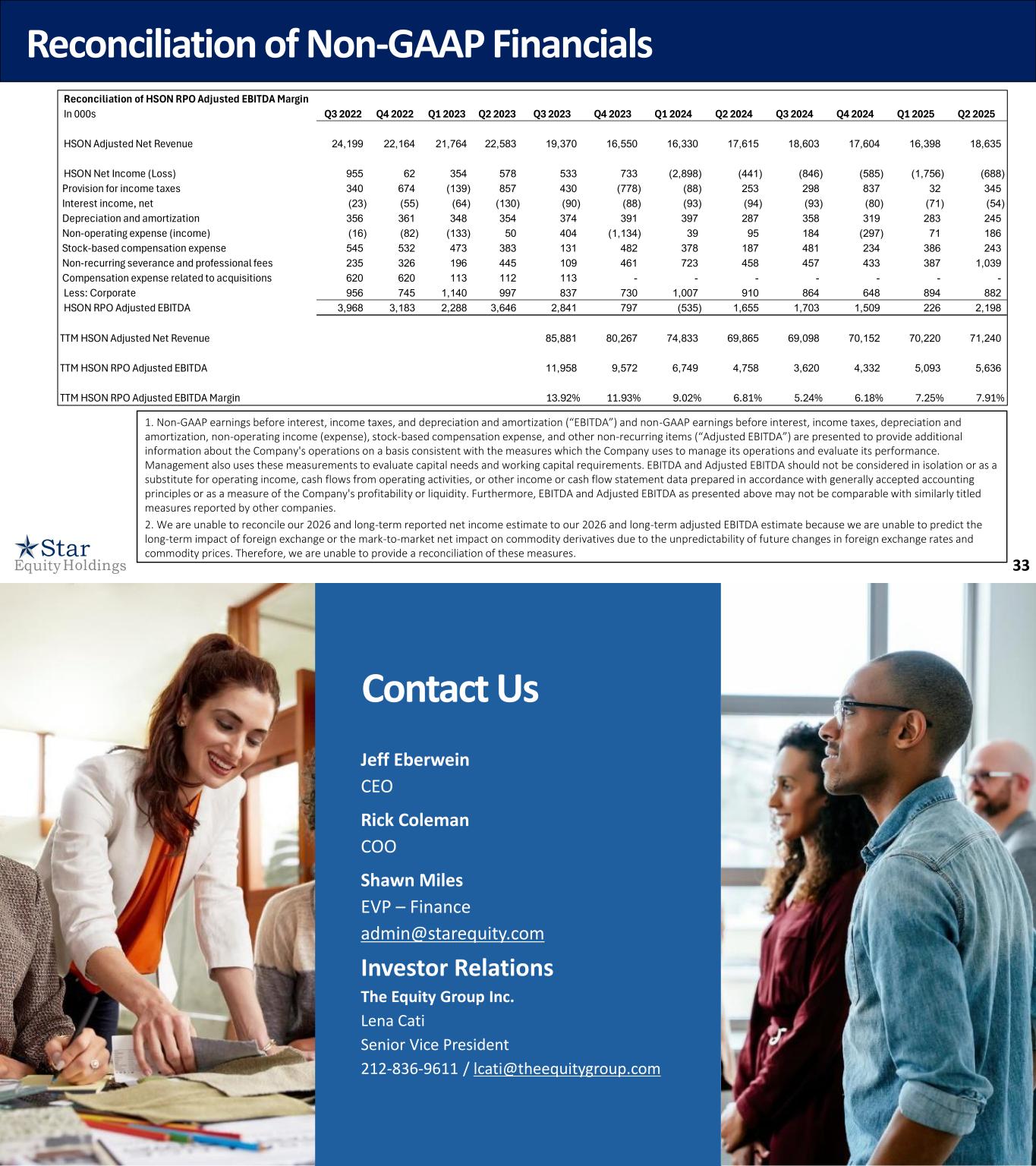 33 1. Non-GAAP earnings before interest, income taxes, and depreciation and amortization (“EBITDA”) and non-GAAP earnings before interest, income taxes, depreciation and amortization, non-operating income (expense), stock-based compensation expense, and other non-recurring items (“Adjusted EBITDA”) are presented to provide additional information about the Company's operations on a basis consistent with the measures which the Company uses to manage its operations and evaluate its performance. Management also uses these measurements to evaluate capital needs and working capital requirements. EBITDA and Adjusted EBITDA should not be considered in isolation or as a substitute for operating income, cash flows from operating activities, or other income or cash flow statement data prepared in accordance with generally accepted accounting principles or as a measure of the Company's profitability or liquidity. Furthermore, EBITDA and Adjusted EBITDA as presented above may not be comparable with similarly titled measures reported by other companies. 2. We are unable to reconcile our 2026 and long-term reported net income estimate to our 2026 and long-term adjusted EBITDA estimate because we are unable to predict the long-term impact of foreign exchange or the mark-to-market net impact on commodity derivatives due to the unpredictability of future changes in foreign exchange rates and commodity prices. Therefore, we are unable to provide a reconciliation of these measures. Reconciliation of Non-GAAP Financials Reconciliation of HSON RPO Adjusted EBITDA Margin In 000s Q3 2022 Q4 2022 Q1 2023 Q2 2023 Q3 2023 Q4 2023 Q1 2024 Q2 2024 Q3 2024 Q4 2024 Q1 2025 Q2 2025 HSON Adjusted Net Revenue 24,199 22,164 21,764 22,583 19,370 16,550 16,330 17,615 18,603 17,604 16,398 18,635 HSON Net Income (Loss) 955 62 354 578 533 733 (2,898) (441) (846) (585) (1,756) (688) Provision for income taxes 340 674 (139) 857 430 (778) (88) 253 298 837 32 345 Interest income, net (23) (55) (64) (130) (90) (88) (93) (94) (93) (80) (71) (54) Depreciation and amortization 356 361 348 354 374 391 397 287 358 319 283 245 Non-operating expense (income) (16) (82) (133) 50 404 (1,134) 39 95 184 (297) 71 186 Stock-based compensation expense 545 532 473 383 131 482 378 187 481 234 386 243 Non-recurring severance and professional fees 235 326 196 445 109 461 723 458 457 433 387 1,039 Compensation expense related to acquisitions 620 620 113 112 113 - - - - - - - Less: Corporate 956 745 1,140 997 837 730 1,007 910 864 648 894 882 HSON RPO Adjusted EBITDA 3,968 3,183 2,288 3,646 2,841 797 (535) 1,655 1,703 1,509 226 2,198 TTM HSON Adjusted Net Revenue 85,881 80,267 74,833 69,865 69,098 70,152 70,220 71,240 TTM HSON RPO Adjusted EBITDA 11,958 9,572 6,749 4,758 3,620 4,332 5,093 5,636 TTM HSON RPO Adjusted EBITDA Margin 13.92% 11.93% 9.02% 6.81% 5.24% 6.18% 7.25% 7.91% 34 Contact Us Jeff Eberwein CEO Rick Coleman COO Shawn Miles EVP – Finance admin@starequity.com Investor Relations The Equity Group Inc. Lena Cati Senior Vice President 212-836-9611 / lcati@theequitygroup.com