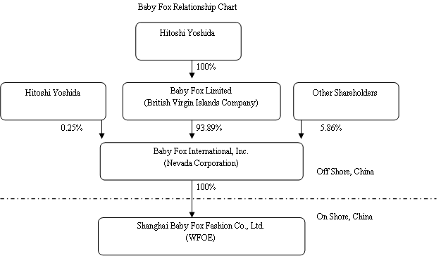 Baby Fox International, Inc. (“Baby Fox”) is a Nevada corporation organized on August 13, 2007 by Hitoshi Yoshida, a Japanese citizen, as a listing vehicle to acquire Shanghai Baby Fox Fashion Co., Ltd. (“Shanghai Baby Fox”) and to be quoted on the Over-The-Counter Bulletin Board (“OTCBB”). Shanghai Baby Fox, a wholly owned China-based subsidiary of Baby Fox, was originally founded by our board director, Fengling Wang, in March 2006 under Chinese laws. On September 20, 2007, we entered into an Equity Share Acquisition Agreement with Fengling Wang. Pursuant to the Equity Share Acquisition Agreement, we purchased 100% of the equity shares of Shanghai Baby Fox in exchange for 5.72 million RMB, approximately equivalent to $806,608. Since at the time of the acquisition, Hitoshi Yoshida and Fengling Wang were married to each other, this transaction is deemed between entities under common control, the financial statements in this annual report are those of Shanghai Baby Fox. The transaction was treated as a reverse merger and, accordingly, Shanghai Baby Fox is the accounting acquirer and Baby Fox is the legal acquirer. The acquisition was consummated on November 26, 2007 when we received the Certificate of Approval from the Shanghai Foreign Economic Relation & Trade Commission.