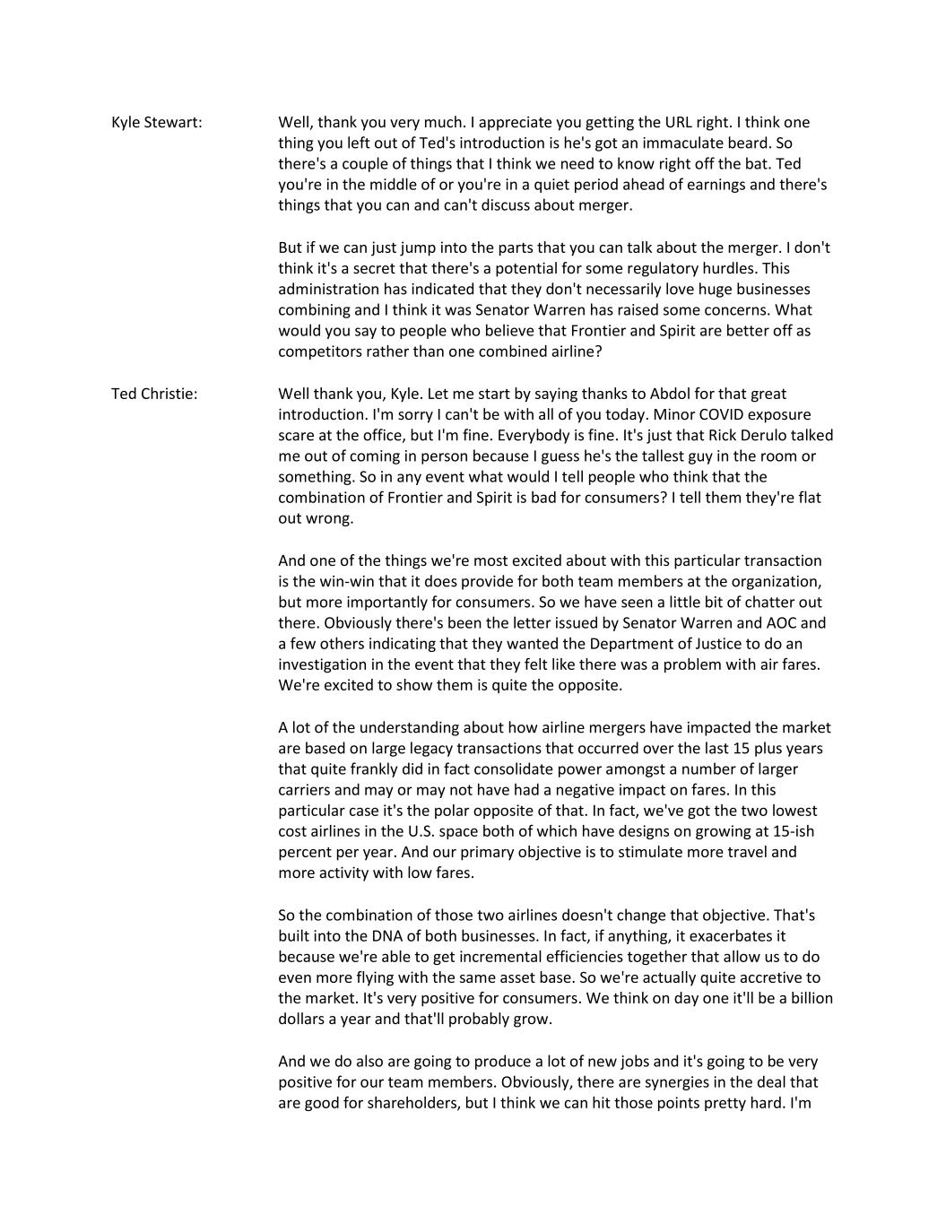 Kyle Stewart: Well, thank you very much. I appreciate you getting the URL right. I think one thing you left out of Ted's introduction is he's got an immaculate beard. So there's a couple of things that I think we need to know right off the bat. Ted you're in the middle of or you're in a quiet period ahead of earnings and there's things that you can and can't discuss about merger. But if we can just jump into the parts that you can talk about the merger. I don't think it's a secret that there's a potential for some regulatory hurdles. This administration has indicated that they don't necessarily love huge businesses combining and I think it was Senator Warren has raised some concerns. What would you say to people who believe that Frontier and Spirit are better off as competitors rather than one combined airline? Ted Christie: Well thank you, Kyle. Let me start by saying thanks to Abdol for that great introduction. I'm sorry I can't be with all of you today. Minor COVID exposure scare at the office, but I'm fine. Everybody is fine. It's just that Rick Derulo talked me out of coming in person because I guess he's the tallest guy in the room or something. So in any event what would I tell people who think that the combination of Frontier and Spirit is bad for consumers? I tell them they're flat out wrong. And one of the things we're most excited about with this particular transaction is the win-win that it does provide for both team members at the organization, but more importantly for consumers. So we have seen a little bit of chatter out there. Obviously there's been the letter issued by Senator Warren and AOC and a few others indicating that they wanted the Department of Justice to do an investigation in the event that they felt like there was a problem with air fares. We're excited to show them is quite the opposite. A lot of the understanding about how airline mergers have impacted the market are based on large legacy transactions that occurred over the last 15 plus years that quite frankly did in fact consolidate power amongst a number of larger carriers and may or may not have had a negative impact on fares. In this particular case it's the polar opposite of that. In fact, we've got the two lowest cost airlines in the U.S. space both of which have designs on growing at 15-ish percent per year. And our primary objective is to stimulate more travel and more activity with low fares. So the combination of those two airlines doesn't change that objective. That's built into the DNA of both businesses. In fact, if anything, it exacerbates it because we're able to get incremental efficiencies together that allow us to do even more flying with the same asset base. So we're actually quite accretive to the market. It's very positive for consumers. We think on day one it'll be a billion dollars a year and that'll probably grow. And we do also are going to produce a lot of new jobs and it's going to be very positive for our team members. Obviously, there are synergies in the deal that are good for shareholders, but I think we can hit those points pretty hard. I'm