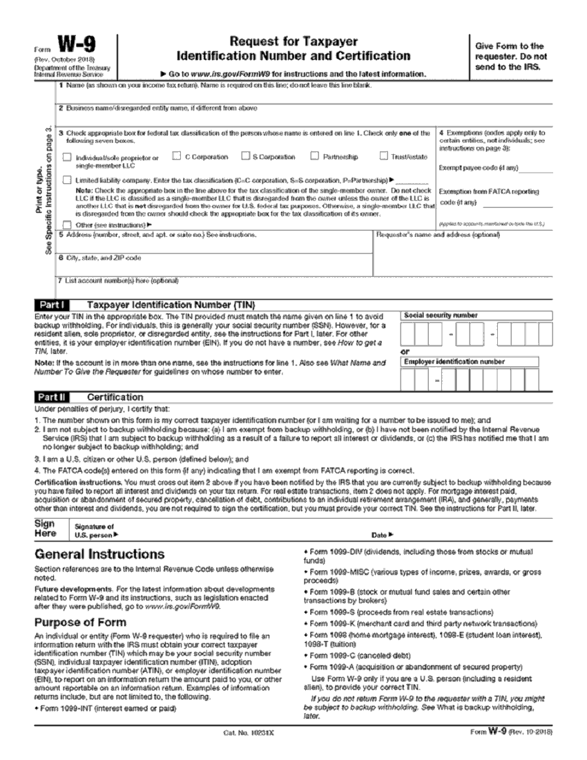 Form W-9 (Rev. October 2018) Department of the Treasury Internal Revenue Service Request for Taxpayer Identification Number and Certification ▶ Go to www.irs.gov/FormW9 for instructions and the latest information. Give Form to the requester. Do not send to the IRS. Print or type. See Specific Instructions on page 3. 1 Name (as shown on your income tax return). Name is required on this line; do not leave this line blank. 2 Business name/disregarded entity name, if different from above 3 Check appropriate box for federal tax classification of the person whose name is entered on line 1. Check only one of the following seven boxes. Individual/sole proprietor or C Corporation S Corporation PartnershipTrust/estate single-member LLC Limited liability company. Enter the tax classification (C=C corporation, S=S corporation, P=Partnership) ▶ Note: Check the appropriate box in the line above for the tax classification of the single-member owner. Do not check LLC if the LLC is classified as a single-member LLC that is disregarded from the owner unless the owner of the LLC is another LLC that is not disregarded from the owner for U.S. federal tax purposes. Otherwise, a single-member LLC that is disregarded from the owner should check the appropriate box for the tax classification of its owner. Other (see instructions) ▶ 4 Exemptions (codes apply only to certain entities, not individuals; see instructions on page 3): Exempt payee code (if any) Exemption from FATCA reporting code (if any) (Applies to accounts maintained outside the U.S.) 5 Address (number, street, and apt. or suite no.) See instructions. Requester’s name and address (optional) 6 City, state, and ZIP code 7 List account number(s) here (optional) Part I Taxpayer Identification Number (TIN) Social security number – – Employer identification number – Part II Certification Note: If the account is in more than one name, see the instructions for line 1. Also see What Name and Number To Give the Requester for guidelines on whose number to enter. Under penalties of perjury, I certify that: 1. The number shown on this form is my correct taxpayer identification number (or I am waiting for a number to be issued to me); and 2. I am not subject to backup withholding because: (a) I am exempt from backup withholding, or (b) I have not been notified by the Internal Revenue Service (IRS) that I am subject to backup withholding as a result of a failure to report all interest or dividends, or (c) the IRS has notified me that I am no longer subject to backup withholding; and 3. I am a U.S. citizen or other U.S. person (defined below); and 4. The FATCA code(s) entered on this form (if any) indicating that I am exempt from FATCA reporting is correct. Certification instructions. You must cross out item 2 above if you have been notified by the IRS that you are currently subject to backup withholding because you have failed to report all interest and dividends on your tax return. For real estate transactions, item 2 does not apply. For mortgage interest paid, acquisition or abandonment of secured property, cancellation of debt, contributions to an individual retirement arrangement (IRA), and generally, payments other than interest and dividends, you are not required to sign the certification, but you must provide your correct TIN. See the instructions for Part II, later. Sign Here Signature of U.S. person ▶Date ▶ General Instructions Section references are to the Internal Revenue Code unless otherwise noted. Future developments. For the latest information about developments related to Form W-9 and its instructions, such as legislation enacted after they were published, go to www.irs.gov/FormW9. Purpose of Form An individual or entity (Form W-9 requester) who is required to file an information return with the IRS must obtain your correct taxpayer identification number (TIN) which may be your social security number (SSN), individual taxpayer identification number (ITIN), adoption taxpayer identification number (ATIN), or employer identification number (EIN), to report on an information return the amount paid to you, or other amount reportable on an information return. Examples of information returns include, but are not limited to, the following. • Form 1099-INT (interest earned or paid) • Form 1099-DIV (dividends, including those from stocks or mutual funds) • Form 1099-MISC (various types of income, prizes, awards, or gross proceeds) • Form 1099-B (stock or mutual fund sales and certain other transactions by brokers) • Form 1099-S (proceeds from real estate transactions) • Form 1099-K (merchant card and third party network transactions) • Form 1098 (home mortgage interest), 1098-E (student loan interest), 1098-T (tuition) • Form 1099-C (canceled debt) • Form 1099-A (acquisition or abandonment of secured property) Use Form W-9 only if you are a U.S. person (including a resident alien), to provide your correct TIN. If you do not return Form W-9 to the requester with a TIN, you might be subject to backup withholding. See What is backup withholding, later. Cat. No. 10231XForm W-9 (Rev. 10-2018)