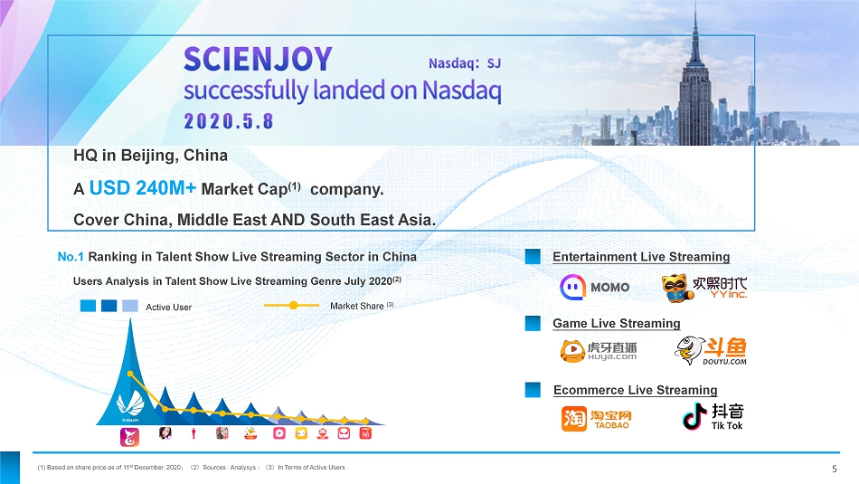 Why SCIENJOY ? LARGEST Your choice of tapping into the world’s largest live streaming market NO.1 No. 1 in talent show mobile live streaming sector in China $130M Revenue Appealing financial fundamentals P/E Below market average P/E Share Price On the verge of rising trend of share price 4
