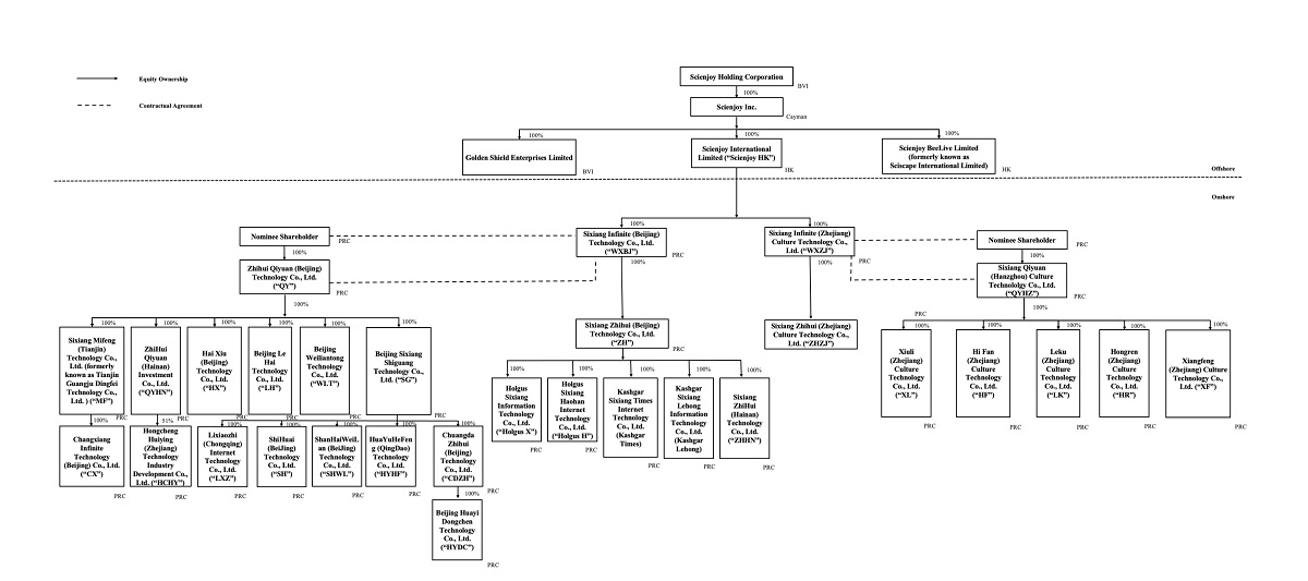 Investors in our Class A ordinary shares thus are not purchasing equity interest in our operating entities in China but instead are purchasing equity interest in a British Virgin Islands holding company. As used in this prospectus, “SHC” refers to SCIENJOY HOLDING CORPORATION; “we,” “us,” “our company,” “our,” or “the Company” refer to SCIENJOY HOLDING CORPORATION and its subsidiaries; “our PRC subsidiaries” refer to our wholly foreign owned entities (the “WFOEs”), Sixiang Infinite (Beijing) Technology Co., Ltd. (“WXBJ”), Sixiang Infinite (Zhejiang) Culture Technology Co., Ltd. (“WXZJ”), Scienjoy International Limited, and Scienjoy BeeLive Limited and their respective subsidiaries. The “VIEs” refer to the PRC variable interest entities, including Zhihui Qiyuan VIEs and Sixiang Qiyuan VIEs. Zhihui Qiyuan VIEs include Zhihui Qiyuan (Beijing) Technology, Co. Ltd. (智汇启源(北京)科技有限公司) or Zhihui Qiyuan, a limited liability company organized and existing under the laws of the PRC, and Zhihui Qiyuan’s subsidiaries, including Hai Xiu (Beijing) Technology Company Co. Ltd., Beijing Le Hai Technology Co. Ltd., Beijing Sixiang Shiguang Technology Co. Ltd., Sixiang Mifeng (Tianjin) Technology Co., Ltd (formerly known as Tianjin Guangju Dingfei Technology Co., Ltd.), Changxiang Infinite Technology (Beijing) Co., Ltd., Lixiaozhi (Chongqing) Internet Technology Co., Ltd., ZhiHui QiYuan (HaiNan) Investment Co., Ltd., ShiHuai (Beijing) Technology Co., Ltd., ShanHaiWeiLan (Beijing) Technology Co., Ltd., HuaYuHeFeng (Qingdao) Technology Co., Ltd., Beijing Weiliantong Technology Co., Ltd. Chuangda Zhihui (Beijing) Technology Co., Ltd (“CDZH”), and Beijing Huayi Dongchen Technology Co., Ltd. (“HYDC”), each such company formed under PRC Law. Sixiang Qiyuan VIEs include Sixiang Qiyuan (Hangzhou) Culture Technology Co., Ltd. and its subsidiaries, including Xiuli (Zhejiang) Culture Technology Co., Ltd., Leku (Zhejiang) Culture Technology Co., Xiangfeng (Zhejiang) Culture Technology Co., Ltd., and Hongren (Zhejiang) Culture Technology Co., Ltd., each such company formed under PRC Law.