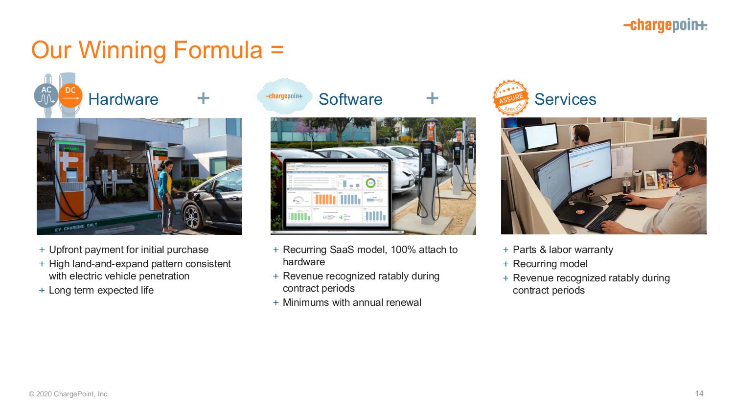 © 2020 ChargePoint, Inc. Commercial Business Fleet Business Residential Business One Portfolio Serves Many Geos and Segments North America + Proven model, de facto leader + Expected gross margin in the 40s North America and Europe + Largest contributor to growth + Stabilization of new products expected to yield improved gross margin + Excess commercial capacity available to fleet (off - hours charging) Europe + Large addressable market + Billings growth > North America as we capture share + Global product in 2021 expected to drive up margin + Leasing Company path to market North America + Scaling Multi Family and direct - to - consumer channels + Utilities expanding their residential programs + Common product powers Fleet and residential Europe + Leasing Company path to market includes home and work charging solutions One comprehensive portfolio deployed globally, with modest regional variations as needed [ ] + + Product Portfolio Leverage 13