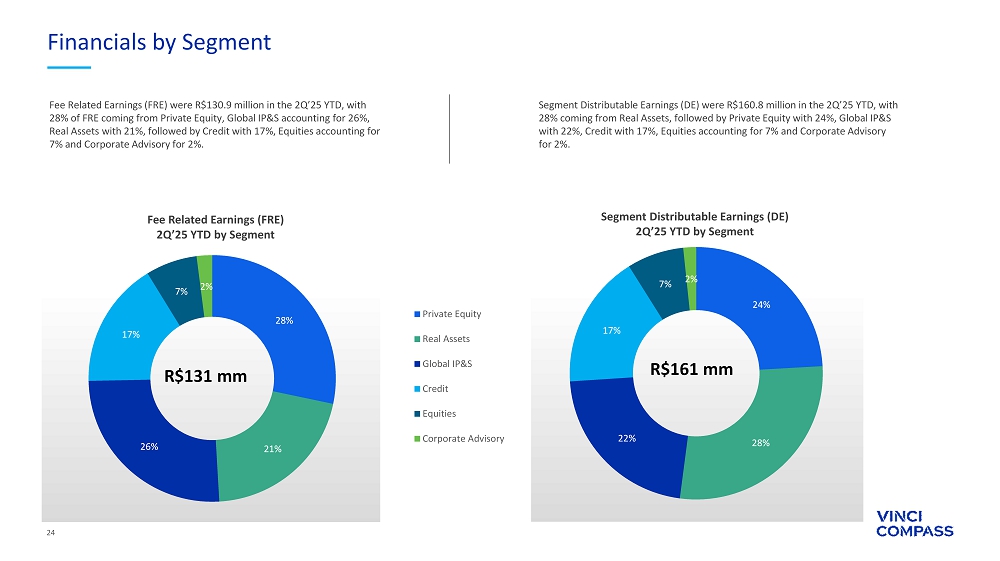 24 Financials by Segment Fee Related Earnings (FRE) 2Q ’25 YTD by Segment Segment Distributable Earnings (DE) 2Q’25 YTD by Segment Fee Related Earnings (FRE) were R$130.9 million in the 2Q’25 YTD, with 28% of FRE coming from Private Equity, Global IP&S accounting for 26%, Real Assets with 21%, followed by Credit with 17%, Equities accounting for 7% and Corporate Advisory for 2%. Segment Distributable Earnings (DE) were R$160.8 million in the 2Q’25 YTD, with 28% coming from Real Assets, followed by Private Equity with 24%, Global IP&S with 22%, Credit with 17%, Equities accounting for 7% and Corporate Advisory for 2%. R$161 mm R$131 mm 28% 21% 26% 17% 7% 2% 24% 28% 22% 17% 7% 2% Private Equity Real Assets Global IP&S Credit Equities Corporate Advisory