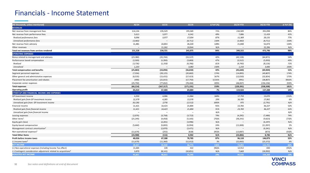 32 Financials - Income Statement ∆ YoY (%) 2Q'25 YTD 2Q'24 YTD ∆ YoY (%) 2Q'25 1Q'25 2Q'24 (R$ thousands, unless mentioned) REVENUES 86% 391,098 210,589 71% 195,569 195,529 114,134 Net revenue from management fees 45% 11,419 7,886 49% 8,342 3,077 5,613 Net revenue from performance fees 77% 20,131 11,369 87% 17,054 3,077 9,096 Realized performance fees 150% (8,711) (3,483) 150% (8,711) – (3,483) Unrealized performance fees 134% 51,073 21,840 128% 26,220 24,853 11,481 Net revenue from advisory N/A 22,206 – N/A 10,944 11,262 – Other revenues 98% 475,796 240,315 84% 241,075 234,721 131,228 Total net revenues from services rendered OPERATING EXPENSES 54% (64,871) (42,128) 42% (33,127) (31,744) (23,380) Bonus related to management and advisory 43% (5,033) (3,512) 47% (3,683) (1,350) (2,503) Performance based compensation 71% (8,116) (4,745) 81% (6,766) (1,350) (3,736) Realized 150% 3,083 1,233 150% 3,083 – 1,233 Unrealized 53% (69,904) (45,640) 42% (36,810) (33,094) (25,883) Total compensation and benefits 174% (40,807) (14,893) 174% (20,682) (20,125) (7,556) Segment personnel expenses 173% (32,854) (12,030) 167% (17,423) (15,431) (6,535) Other general and administrative expenses 3816% (38,807) (991) 3,531% (17,792) (21,015) (490) Placement fee amortization and rebates 233% (156,136) (46,837) 205% (78,484) (77,652) (25,750) Corporate center expenses 181% (338,508) (120,391) 159% (171,191) (167,317) (66,214) Total expenses 14% 137,288 119,924 7% 69,884 67,404 65,014 Operating profit OTHER GP AND FINANCIAL INCOME AND EXPENSES (15)% 15,070 17,759 160% 11,064 4,006 4,250 GP Investment income 6% 17,861 16,785 10% 13,576 4,285 12,379 Realized gain from GP investment income N/A (2,791) 975 (69)% (2,512) (279) (8,128) Unrealized gain from GP investment income 52% 36,227 23,783 91% 21,804 14,423 11,421 Financial income 52% 36,227 23,783 91% 21,804 14,423 11,421 Realized gain from financial income N/A – – N/A – – – Unrealized gain from financial income 74% (7,480) (4,292) 79% (3,722) (3,758) (2,076) Leasing expenses (73)% (9,623) (36,241) (76)% (5,165) (4,458) (21,249) Other items¹ N/A (6,197) – N/A (3,996) (2,201) – Equity gain (loss) 2% (11,997) (11,808) 24% (6,994) (5,003) (5,660) Equity - based compensation N/A (6,341) – N/A (3,471) (2,870) – Management contract amortization² (93)% (873) (13,007) (95)% (618) (255) (11,674) Non - operational expenses³ N/A 8,786 (23,806) N/A 8,902 (116) (24,988) Total Other Items 52% 146,073 96,118 97% 78,785 67,288 40,026 Profit before income taxes 6% (23,372) (22,063) 3% (12,012) (11,360) (11,679) ( - ) Income taxes⁴ 66% 122,701 74,055 136% 66,773 55,928 28,347 NET INCOME (95)% 650 12,912 (96)% 422 228 11,604 (+) Non - operational expenses (including Income Tax effect) N/A (18,992) 7,669 N/A (10,851) (8,141) 3,870 ( - ) Contingent consideration adjustment related to acquisitions⁵ 10% 104,360 94,636 29% 56,345 48,015 43,821 ADJUSTED NET INCOME See notes and definitions at end of document