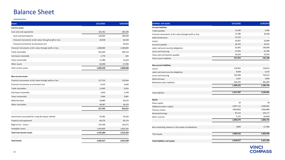 34 Balance Sheet 6/30/2025 3/31/2025 Assets Current assets 189,190 163,782 Cash and cash equivalents 100,449 126,844 Cash and bank deposits 58,148 36,938 Financial instruments at fair value through profit or loss 30,593 - Financial instruments at amortized cost 1,449,809 1,488,809 Financial instruments at fair value through profit or loss 189,754 162,569 Trade receivables 645 1,770 Sub - leases receivable 11,614 11,200 Taxes recoverable 57,596 66,398 Other assets 1,898,608 1,894,528 Total current assets Non - current assets 135,644 127,710 Financial instruments at fair value through profit or loss 6,036 6,334 Financial instruments at amortized cost 6,024 15,603 Trade receivables 3,749 3,910 Sub - leases receivable 3,887 3,969 Taxes recoverable 29,254 29,889 Deferred taxes 39,323 40,287 Other receivables 223,917 227,702 55,455 53,781 Investments accounted for using the equity method 65,274 60,279 Property and equipment 126,571 135,768 Right of use - Leases 1,052,105 1,054,859 Intangible assets 1,523,322 1,532,389 Total non - current assets 3,421,930 3,426,917 Total Assets 6/30/2025 3/31/2025 Liabilities and equity Current liabilities 9,366 12,290 Trade payables 16,106 11,786 Financial instruments at fair value through profit or loss – 15,514 Deferred Revenue 31,804 35,031 Leases 35,231 36,792 Accounts payable 100,640 62,645 Labor and social security obligations 25,786 27,632 Loans and Financing 23,255 26,264 Taxes and contributions payable 242,188 227,954 Total current liabilities Non - current liabilities 110,631 116,025 Leases 6,319 8,658 Labor and social security obligations 722,617 763,298 Loans and Financing 2,839 5,237 Deferred taxes 454,387 416,135 Retirement plans liabilities 1,296,793 1,309,353 1,538,981 1,537,307 Total liabilities Equity 18 18 Share capital 2,094,601 2,097,712 Additional paid - in capital (306,608) (300,082) Treasury shares 101,177 87,214 Retained Earnings (4,443) 5,717 Other reserves 1,884,745 1,890,579 (1,796) (969) Non - controlling interests in the equity of subsidiaries 1,882,949 1,889,610 Total equity 3,421,930 3,426,917 Total liabilities and equity