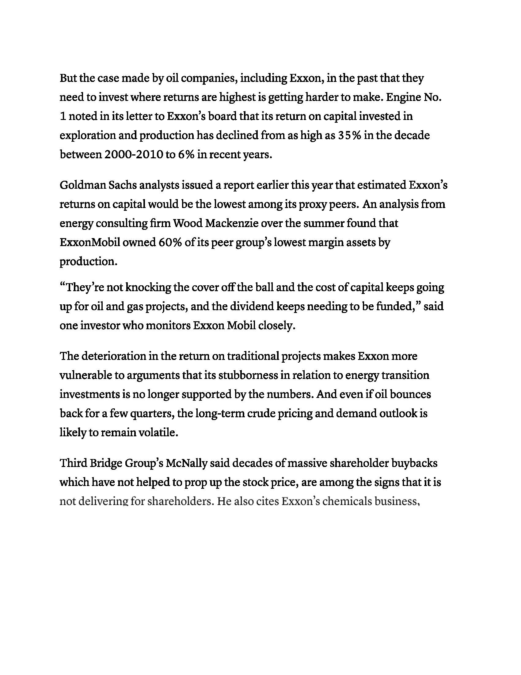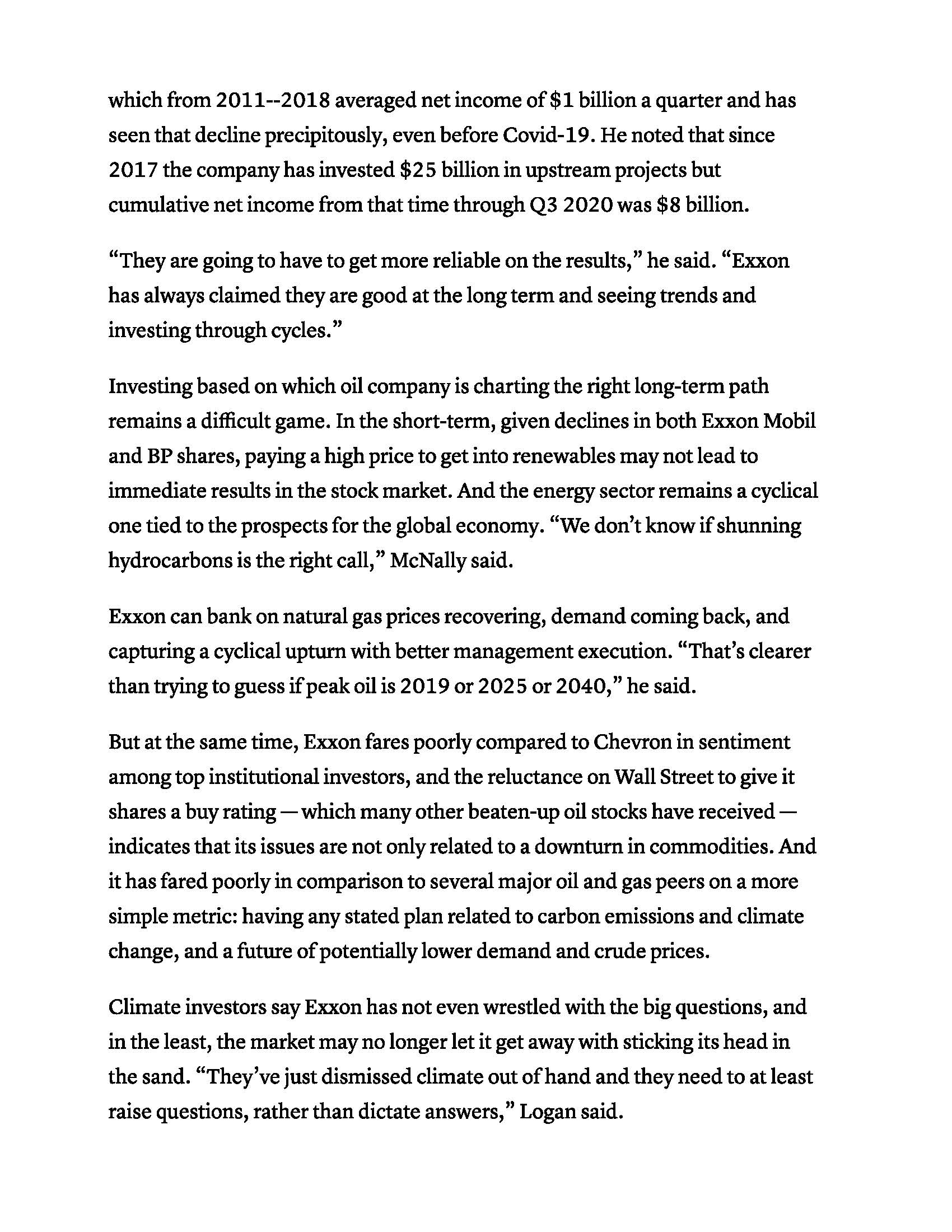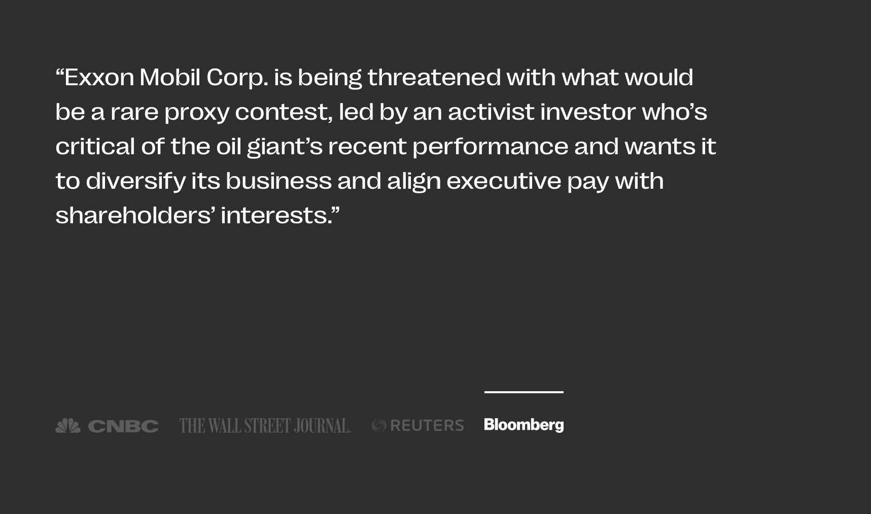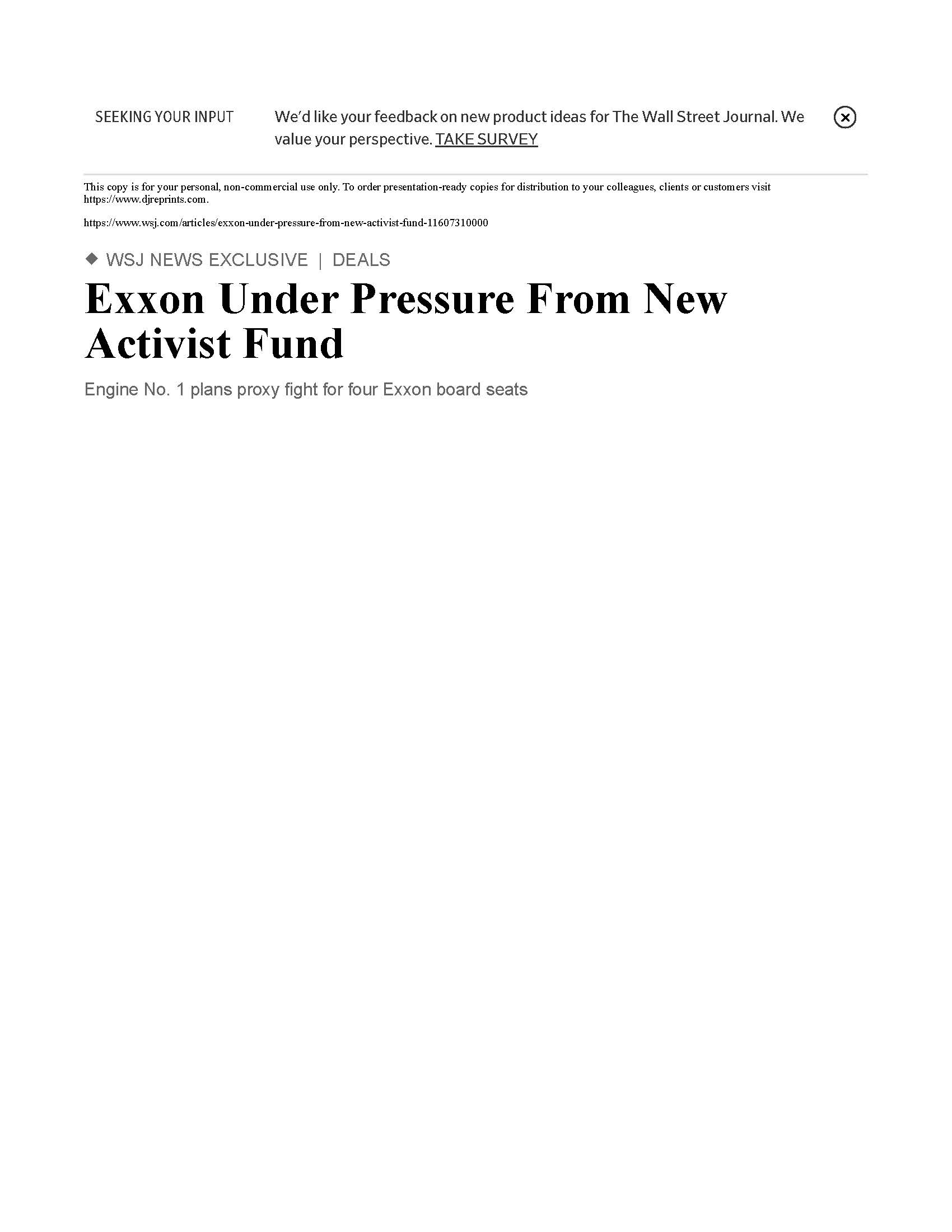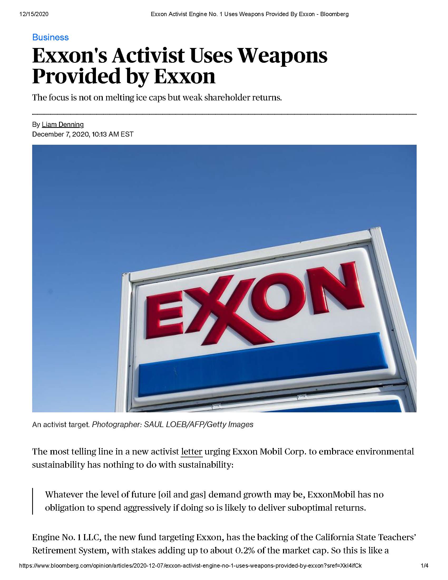 Leslie Picker: It used to be that ESG meant screening out companies that don't comply, but lately activist investors are screening in companies that would be the antithesis of ESG, like big oil and then pushing for changes. That's what's going on at Exxon right now. A new firm called Engine No. 1 led by an under the radar hedge fund manager, Chris James, is running a proxy fight seeking to overhaul the business by installing four directors to the board. Their bulk of their goal is to diversify the business into more clean energy while slashing costs elsewhere to ensure that that sacred dividend is protected. Now the 17-day old firm has just $250 million dollars in assets, mostly James's own money and its stake in Exxon is a nominal $40 million dollars or about .02% of Exxon's market cap but CalSTRS already supports the proposal and D.E. Shaw has reportedly built up a position and is pushing for similar demands as Engine No. 1. As Josh Black of Activist Insight puts it, "Building and maintaining its coalition of outside investors will be a formidable challenge but if marrying environmental impact and profitability proves to be a winning strategy, the next few years will see that convergence continue." In other words, expect more campaigns like this one in 2021.