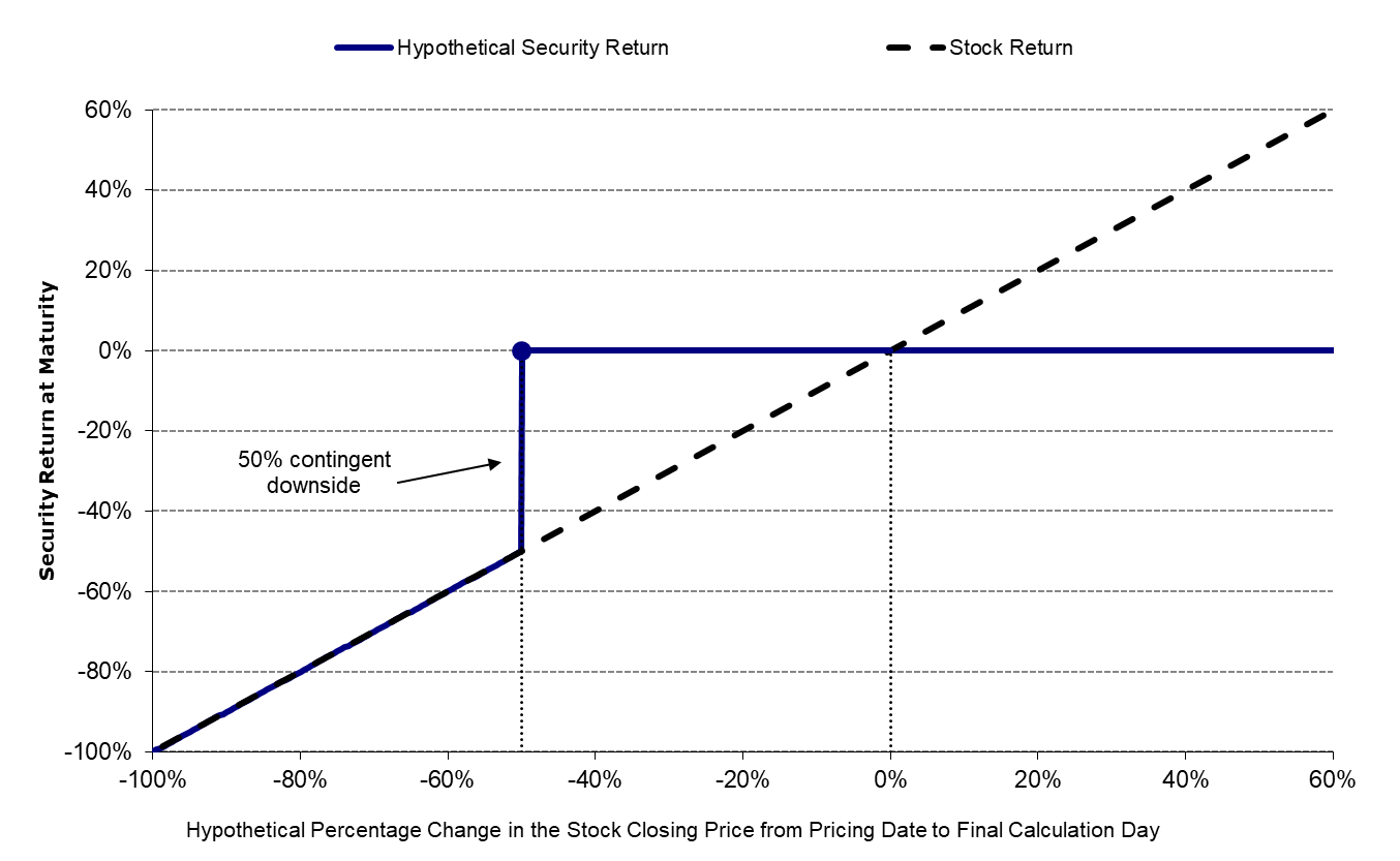 Potential Loss of Principal. If the securities are not automatically called prior to maturity, you will be repaid the principal amount at maturity if, and only if, the stock closing price of the Underlying Stock on the final calculation day is greater than or equal to the threshold price. If the stock closing price of the Underlying Stock on the final calculation day is less than the threshold price, you will have full downside exposure to the decrease in the price of the Underlying Stock from the starting price, and you will lose more than 50%, and possibly all, of the principal amount of your securities. The threshold price for the Underlying Stock is equal to 50% of the starting price.