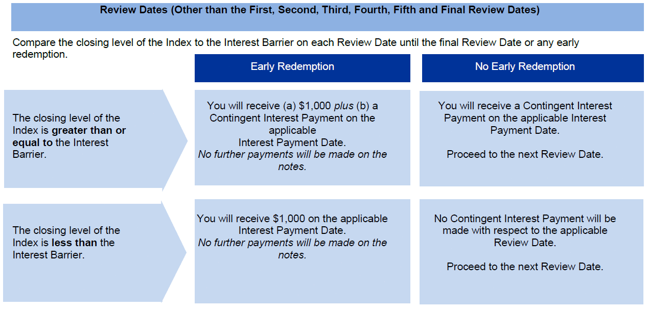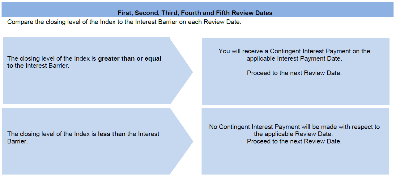 If the closing level of the Index on any Review Date is less than the Interest Barrier, no Contingent Interest Payment will be made with respect to that Review Date.