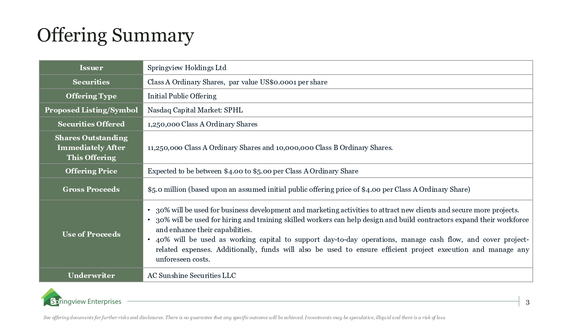 Offering Summary 3 See offering documents for further risks and disclosures. There is no guarantee that any specific outcome will be achieved. Investments may be speculative, illiquid and there is a risk of loss. Springview Holdings Ltd Issuer Class A Ordinary Shares, par value US$0.0001 per share Securities Initial Public Offering Offering Type Nasdaq Capital Market: SPHL Proposed Listing/Symbol 1,250,000 Class A Ordinary Shares Securities Offered 11,250,000 Class A Ordinary Shares and 10,000,000 Class B Ordinary Shares. Shares Outstanding Immediately After This Offering Expected to be between $4.00 to $5.00 per Class A Ordinary Share Offering Price $5.0 million (based upon an assumed initial public offering price of $4.00 per Class A Ordinary Share) Gross Proceeds • 30 % will be used for business development and marketing activities to attract new clients and secure more projects . • 30 % will be used for hiring and training skilled workers can help design and build contractors expand their workforce and enhance their capabilities . • 40 % will be used as working capital to support day - to - day operations, manage cash flow, and cover project - related expenses . Additionally, funds will also be used to ensure efficient project execution and manage any unforeseen costs . Use of Proceeds AC Sunshine Securities LLC Underwriter