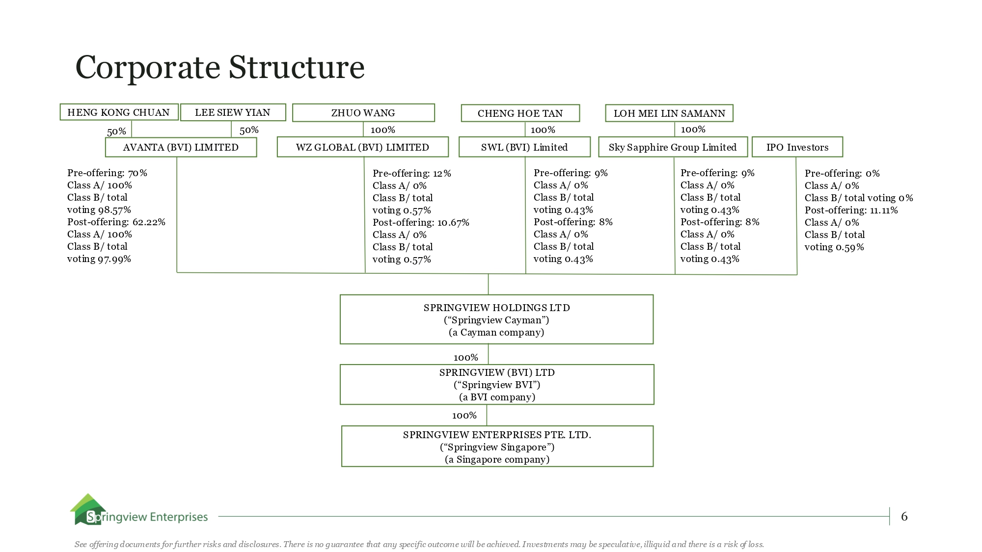Corporate Structure CHENG HOE TAN ZHUO WANG LEE SIEW YIAN LOH MEI LIN SAMANN AVANTA (BVI) LIMITED SPRINGVIEW HOLDINGS LTD (“Springview Cayman”) (a Cayman company) 100% SPRINGVIEW (BVI) LTD (“Springview BVI”) (a BVI company) 100% SPRINGVIEW ENTERPRISES PTE. LTD. (“Springview Singapore”) (a Singapore company) IPO Investors HENG KONG CHUAN 100% 100% 100% SWL (BVI) Limited WZ GLOBAL (BVI) LIMITED Sky Sapphire Group Limited Pre - offering: 12% Class A/ 0% Class B/ total voting 0.57% Post - offering: 10.67% Class A/ 0% Class B/ total voting 0.57% 6 See offering documents for further risks and disclosures. There is no guarantee that any specific outcome will be achieved. Investments may be speculative, illiquid and there is a risk of loss. Pre - offering: 9% Class A/ 0% Class B/ total voting 0.43% Post - offering: 8% Class A/ 0% Class B/ total voting 0.43% Pre - offering: 9% Class A/ 0% Class B/ total voting 0.43% Post - offering: 8% Class A/ 0% Class B/ total voting 0.43% Pre - offering: 0% Class A/ 0% Class B/ total voting 0% Post - offering: 11.11% Class A/ 0% Class B/ total voting 0.59% Pre - offering: 70% Class A/ 100% Class B/ total voting 98.57% Post - offering: 62.22% Class A/ 100% Class B/ total voting 97.99% 50% 50%