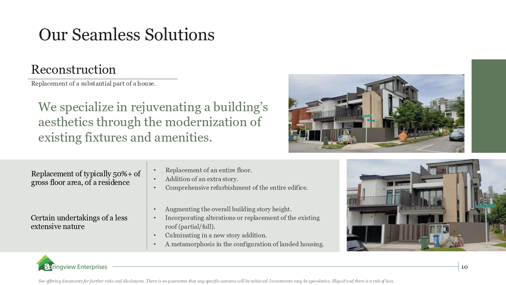 Our Seamless Solutions Reconstruction We specialize in rejuvenating a building’s aesthetics through the modernization of existing fixtures and amenities. Replacement of typically 50%+ of gross floor area, of a residence Certain undertakings of a less extensive nature • Replacement of an entire floor. • Addition of an extra story. • Comprehensive refurbishment of the entire edifice. • Augmenting the overall building story height. • Incorporating alterations or replacement of the existing roof (partial/full). • Culminating in a new story addition. • A metamorphosis in the configuration of landed housing. Replacement of a substantial part of a house. 10 See offering documents for further risks and disclosures. There is no guarantee that any specific outcome will be achieved. Investments may be speculative, illiquid and there is a risk of loss.