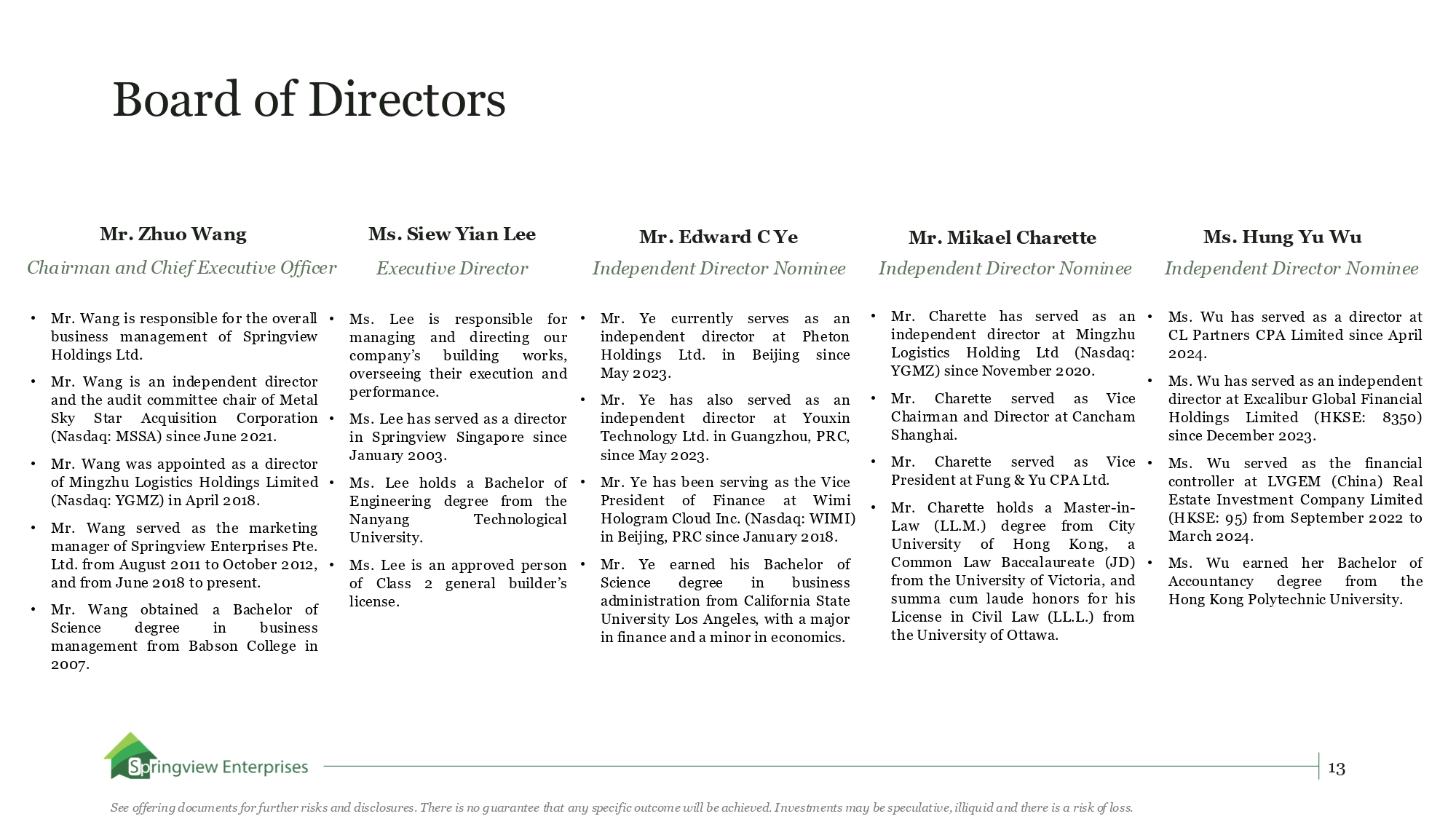 Our Experienced Management Team Mr. Zhuo Wang Chairman and Chief Executive Officer • Mr. Wang is responsible for the overall business management of Springview Holdings Ltd. • Mr. Wang is an independent director and the audit committee chair of Metal Sky Star Acquisition Corporation (Nasdaq: MSSA) since June 2021. • Mr. Wang was appointed as a director of Mingzhu Logistics Holdings Limited (Nasdaq: YGMZ) in April 2018. • Mr. Wang served as the marketing manager of Springview Enterprises Pte. Ltd. from August 2011 to October 2012, and from June 2018 to present. • Mr. Wang obtained a Bachelor of Science degree in business management from Babson College in 2007. Mr. Jordan Yi Chun Tse Chief Financial Officer • Mr. Tse was appointed as Chief Financial Officer on November 15, 2023. • Mr. Tse is an experienced professional with extensive experience in the field of accounting and auditing. • Mr . Tse currently serves as an investment manager at Alpha (Shenzhen) Management Consulting Limited . • Mr . Tse was a co - founder at 24 Seasons (Shenzhen) Supply Chain Management Company Limited from November 2021 to September 2022 . • Mr . Tse worked as a Senior Associate in Core Assurance Services at PricewaterhouseCoopers, Hong Kong from December 2018 to September 2020 . • Mr. Tse obtained a Bachelor of Commerce degree in 2016 from the University of New South Wales. 12 See offering documents for further risks and disclosures. There is no guarantee that any specific outcome will be achieved. Investments may be speculative, illiquid and there is a risk of loss.