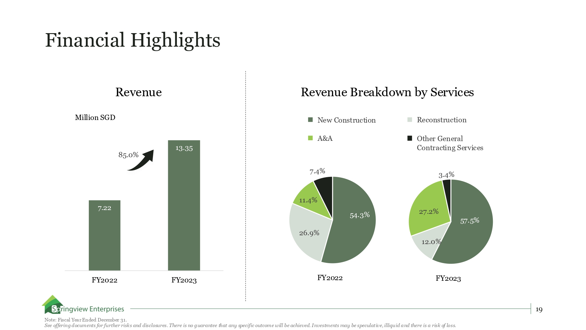 Financial Highlights 7.22 13.35 FY2022 FY2023 Revenue 85.0% Million SGD 54.3% 26.9% 11.4% 7.4% 57.5% 12.0% 27.2% 3.4% Revenue Breakdown by Services New Construction Reconstruction A&A Other General Contracting Services FY2022 FY2023 19 Note: Fiscal Year Ended December 31. See offering documents for further risks and disclosures. There is no guarantee that any specific outcome will be achieved. Investments may be speculative, illiquid and there is a risk of loss.