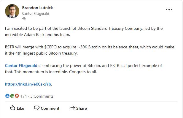 On July 17, 2025, Brandon Lutnick, Chief Executive Officer of CEPO, made below communications on his social media accounts.
