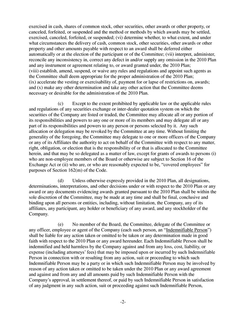 -2- exercised in cash, shares of common stock, other securities, other awards or other property, or canceled, forfeited, or suspended and the method or methods by which awards may be settled, exercised, canceled, forfeited, or suspended; (vi) determine whether, to what extent, and under what circumstances the delivery of cash, common stock, other securities, other awards or other property and other amounts payable with respect to an award shall be deferred either automatically or at the election of the participant or of the Committee; (vii) interpret, administer, reconcile any inconsistency in, correct any defect in and/or supply any omission in the 2010 Plan and any instrument or agreement relating to, or award granted under, the 2010 Plan; (viii) establish, amend, suspend, or waive any rules and regulations and appoint such agents as the Committee shall deem appropriate for the proper administration of the 2010 Plan; (ix) accelerate the vesting or exercisability of, payment for or lapse of restrictions on, awards; and (x) make any other determination and take any other action that the Committee deems necessary or desirable for the administration of the 2010 Plan. (c) Except to the extent prohibited by applicable law or the applicable rules and regulations of any securities exchange or inter-dealer quotation system on which the securities of the Company are listed or traded, the Committee may allocate all or any portion of its responsibilities and powers to any one or more of its members and may delegate all or any part of its responsibilities and powers to any person or persons selected by it. Any such allocation or delegation may be revoked by the Committee at any time. Without limiting the generality of the foregoing, the Committee may delegate to one or more officers of the Company or any of its Affiliates the authority to act on behalf of the Committee with respect to any matter, right, obligation, or election that is the responsibility of or that is allocated to the Committee herein, and that may be so delegated as a matter of law, except for grants of awards to persons (i) who are non-employee members of the Board or otherwise are subject to Section 16 of the Exchange Act or (ii) who are, or who are reasonably expected to be, “covered employees” for purposes of Section 162(m) of the Code. (d) Unless otherwise expressly provided in the 2010 Plan, all designations, determinations, interpretations, and other decisions under or with respect to the 2010 Plan or any award or any documents evidencing awards granted pursuant to the 2010 Plan shall be within the sole discretion of the Committee, may be made at any time and shall be final, conclusive and binding upon all persons or entities, including, without limitation, the Company, any of its affiliates, any participant, any holder or beneficiary of any award, and any stockholder of the Company. (e) No member of the Board, the Committee, delegate of the Committee or any officer, employee or agent of the Company (each such person, an “Indemnifiable Person”) shall be liable for any action taken or omitted to be taken or any determination made in good faith with respect to the 2010 Plan or any award hereunder. Each Indemnifiable Person shall be indemnified and held harmless by the Company against and from any loss, cost, liability, or expense (including attorneys’ fees) that may be imposed upon or incurred by such Indemnifiable Person in connection with or resulting from any action, suit or proceeding to which such Indemnifiable Person may be a party or in which such Indemnifiable Person may be involved by reason of any action taken or omitted to be taken under the 2010 Plan or any award agreement and against and from any and all amounts paid by such Indemnifiable Person with the Company’s approval, in settlement thereof, or paid by such Indemnifiable Person in satisfaction of any judgment in any such action, suit or proceeding against such Indemnifiable Person,