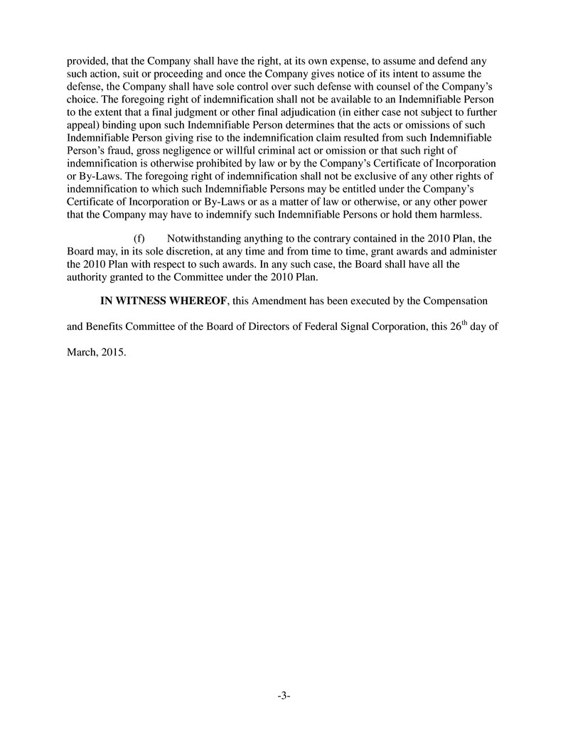 -3- provided, that the Company shall have the right, at its own expense, to assume and defend any such action, suit or proceeding and once the Company gives notice of its intent to assume the defense, the Company shall have sole control over such defense with counsel of the Company’s choice. The foregoing right of indemnification shall not be available to an Indemnifiable Person to the extent that a final judgment or other final adjudication (in either case not subject to further appeal) binding upon such Indemnifiable Person determines that the acts or omissions of such Indemnifiable Person giving rise to the indemnification claim resulted from such Indemnifiable Person’s fraud, gross negligence or willful criminal act or omission or that such right of indemnification is otherwise prohibited by law or by the Company’s Certificate of Incorporation or By-Laws. The foregoing right of indemnification shall not be exclusive of any other rights of indemnification to which such Indemnifiable Persons may be entitled under the Company’s Certificate of Incorporation or By-Laws or as a matter of law or otherwise, or any other power that the Company may have to indemnify such Indemnifiable Persons or hold them harmless. (f) Notwithstanding anything to the contrary contained in the 2010 Plan, the Board may, in its sole discretion, at any time and from time to time, grant awards and administer the 2010 Plan with respect to such awards. In any such case, the Board shall have all the authority granted to the Committee under the 2010 Plan. IN WITNESS WHEREOF, this Amendment has been executed by the Compensation and Benefits Committee of the Board of Directors of Federal Signal Corporation, this 26th day of March, 2015.