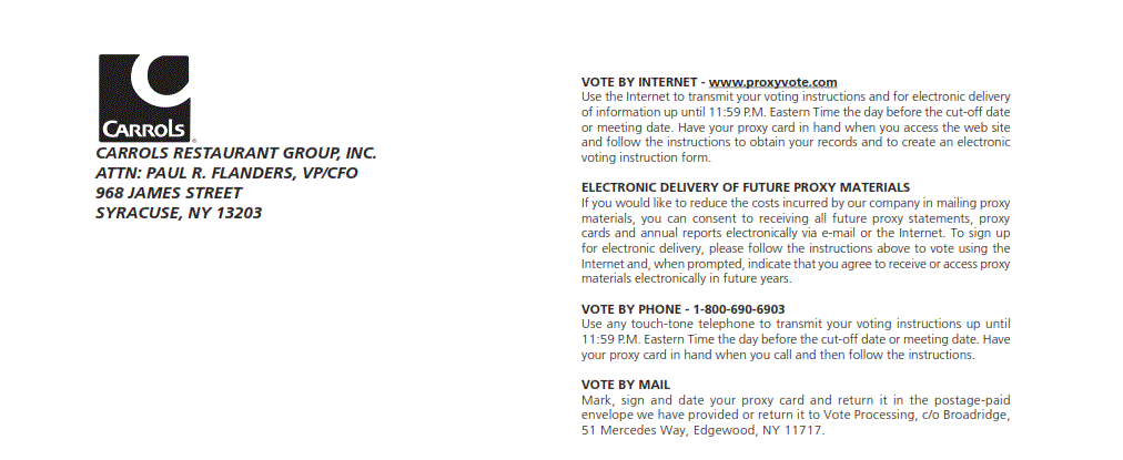 COPIES OF OUR ANNUAL REPORT ON FORM 10-K FOR THE FISCAL YEAR ENDED DECEMBER 30, 2012, TOGETHER WITH FINANCIAL STATEMENTS AND SCHEDULES, AS FILED WITH THE SEC ARE AVAILABLE TO STOCKHOLDERS WITHOUT CHARGE UPON WRITTEN REQUEST ADDRESSED TO WILLIAM E. MYERS, VICE PRESIDENT, GENERAL COUNSEL AND SECRETARY, CARROLS RESTAURANT GROUP, INC., 968 JAMES STREET, SYRACUSE, NEW YORK 13203, OR ORAL REQUEST TO MR. MYERS AT 315-424-0513.