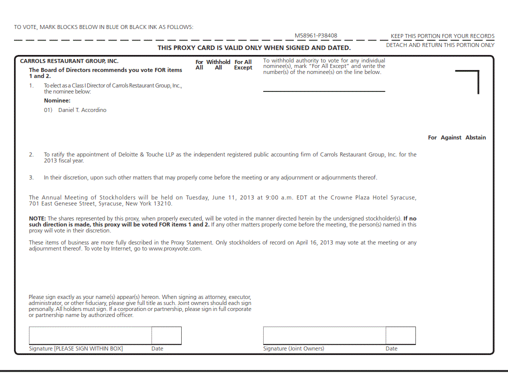 This Proxy Statement is furnished in connection with the solicitation of proxies by the board of directors, also referred to as the "board of directors" or the "board", of CARROLS RESTAURANT GROUP, INC., a Delaware corporation, to be used at the annual meeting of stockholders, which we refer to as the "meeting", of the Company which will be held at Crowne Plaza Hotel Syracuse, 701 East Genesee Street, Syracuse, New York 13210 on Tuesday, June 11, 2013, at 9:00 A.M. (EDT), and at any adjournment or adjournments thereof. Only stockholders of record at the close of business on April 16, 2013, which we refer to as the “record date”, will be entitled to vote at the meeting.