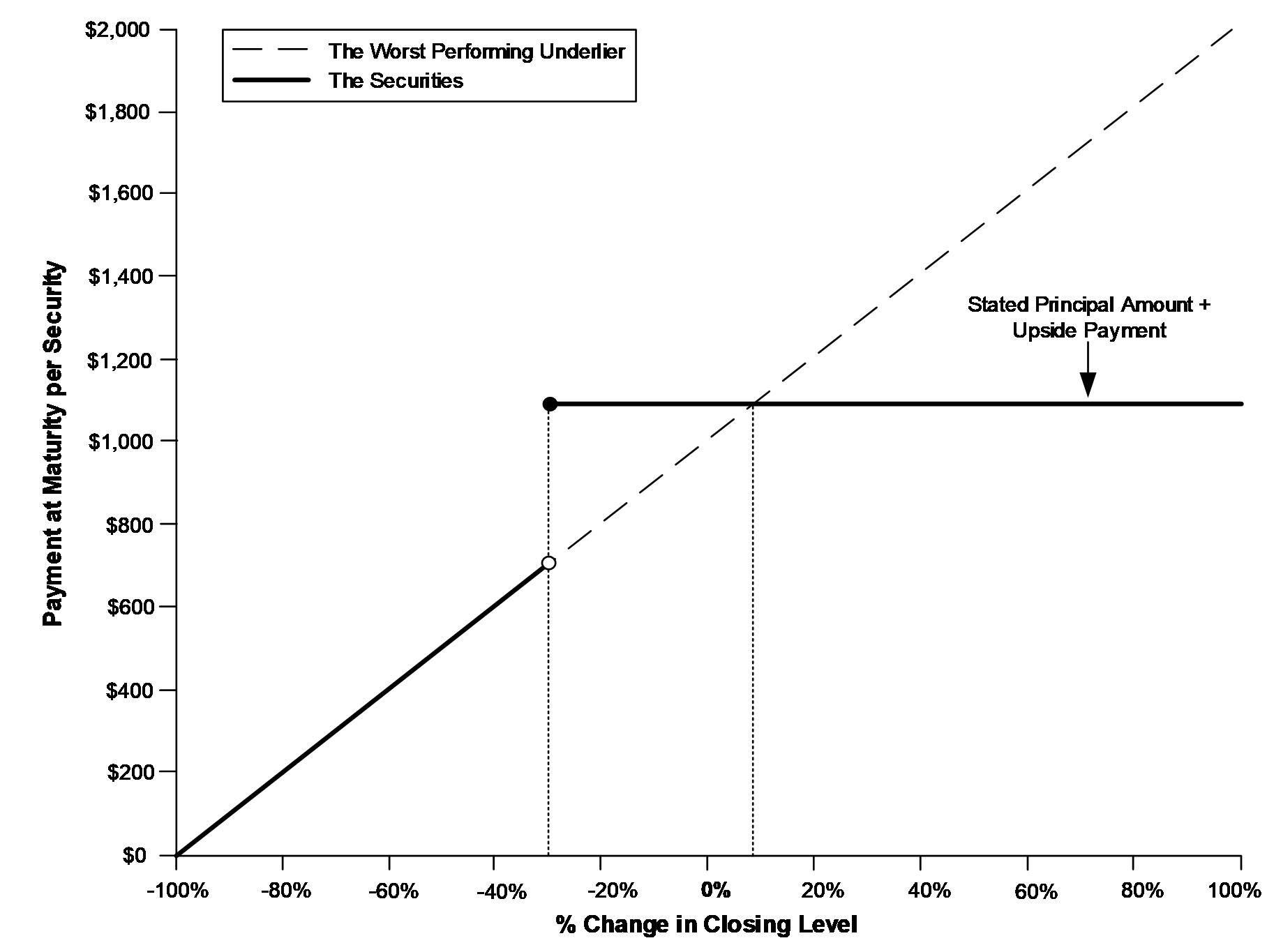 Downside Scenario. If the final level of the worst performing underlier is less than its downside threshold level, investors will receive an amount that is significantly less than the stated principal amount, based on a 1% loss of principal for each 1% decline in the level of the worst performing underlier. There is no minimum payment at maturity, and investors could lose their entire initial investment in the securities.