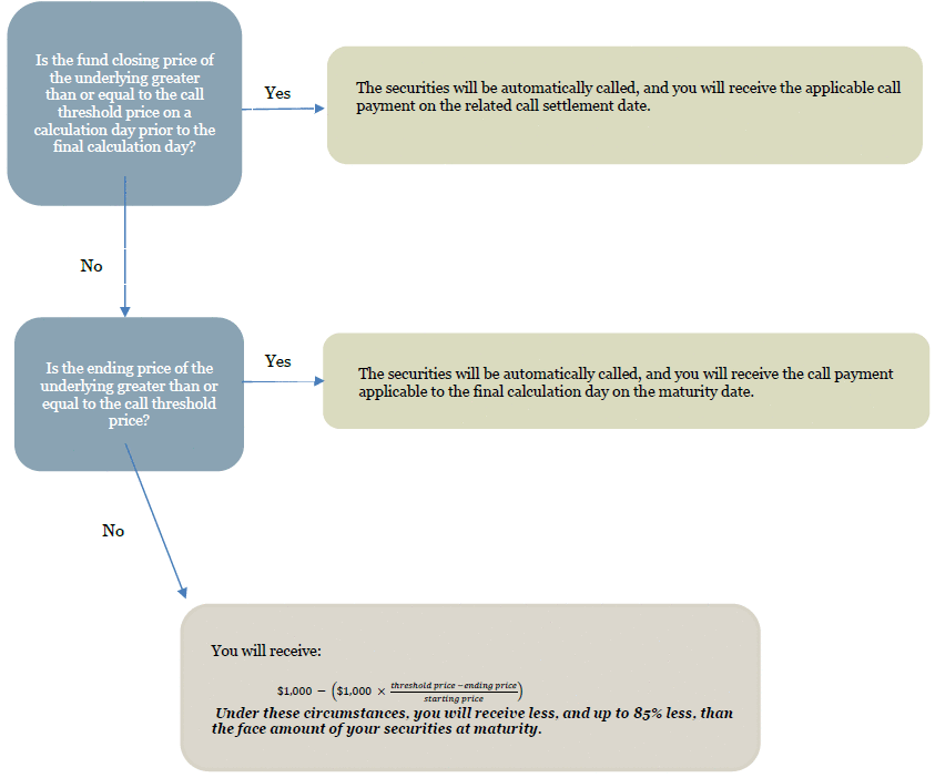 If the securities are not called prior to maturity and the ending price is below the threshold price on the final calculation day, the securities will be exposed to any decline in the fund closing price of the underlying beyond 15%. You may lose up to 85% of the face amount of your securities at maturity.