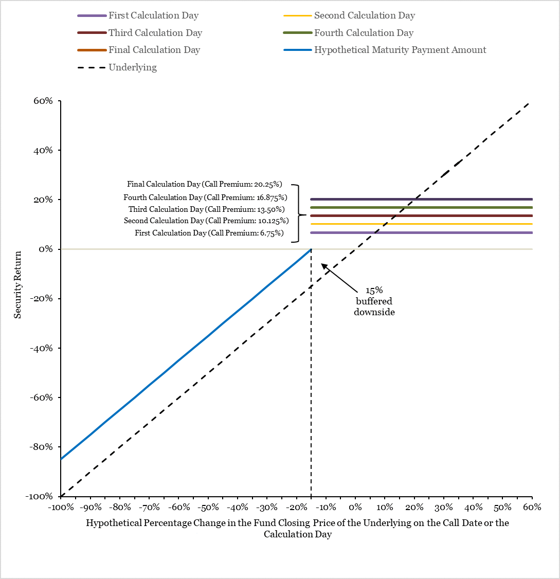 Automatic Call. The securities will be automatically called if the fund closing price of the underlying on any of the calculation days is greater than or equal to 85% of the starting price, which we refer to as the call threshold price, for a call payment equal to the face amount plus a call premium. The call premium applicable to each calculation day will be a percentage of the face amount that increases for each calculation day based on a simple (non-compounding) return of at least approximately 6.75% per annum (to be determined on the pricing date). No further payments will be made on the securities once they have been called.