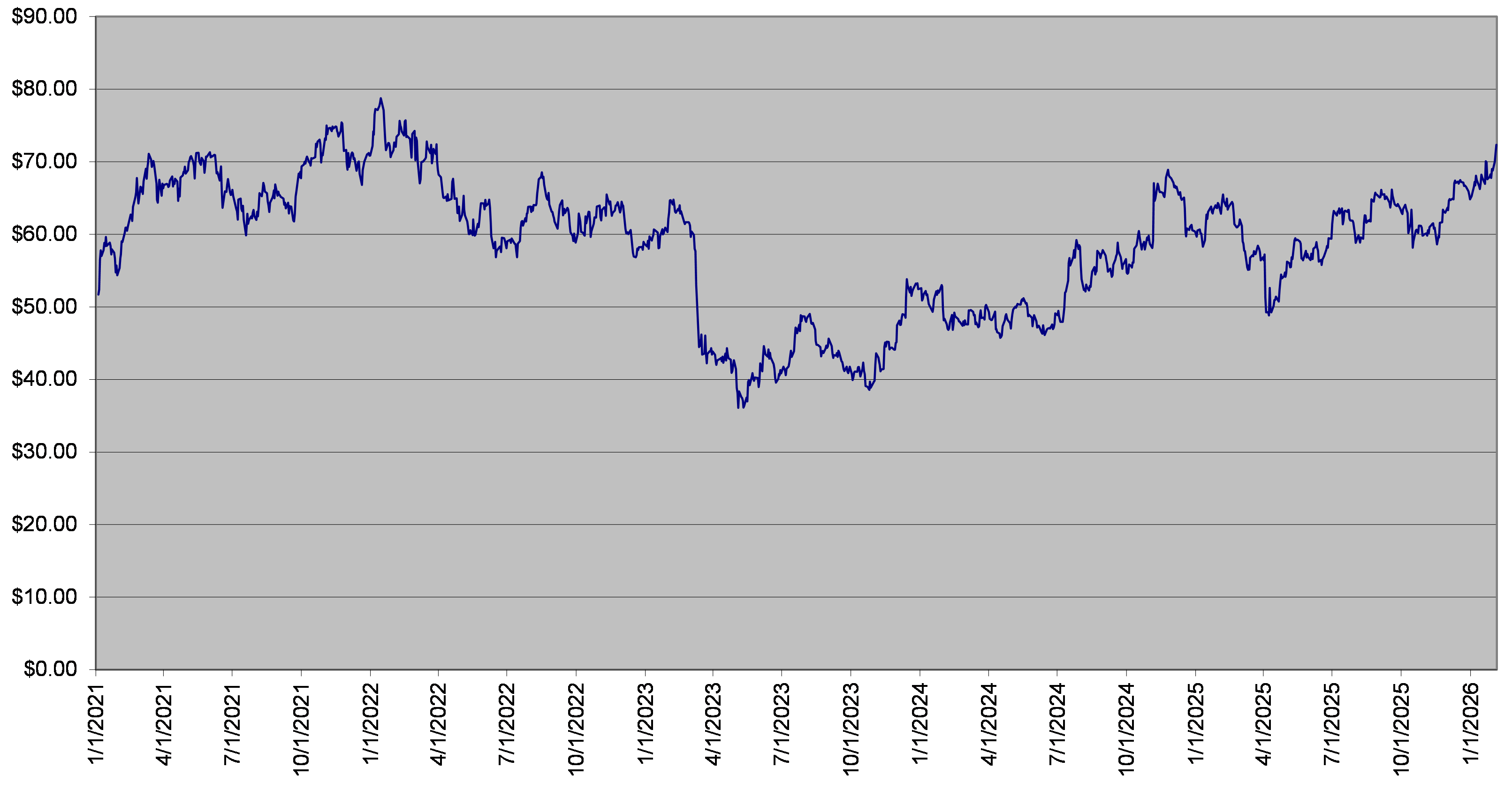 The following graph sets forth the daily closing prices of the underlying for the period from January 1, 2021 through February 4, 2026. The closing price of the underlying on February 4, 2026 was $72.35. We obtained the information in the graph below from Bloomberg Financial Markets without independent verification. You should not take the historical prices of the underlying as an indication of its future performance, and no assurance can be given as to the closing price of the underlying at any time, including on the calculation days.