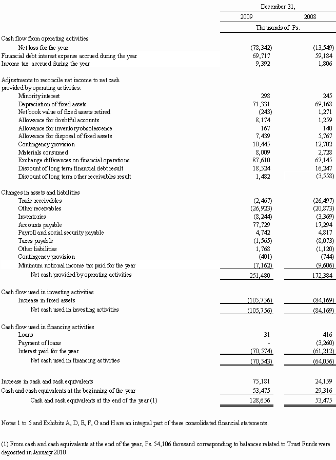 Net cash flows provided by operating activities were Ps. 251,480 thousand during the year ended December 31, 2009 compared to Ps. 172,384 thousand during the previous year. Such variation was mainly due to the decrease in cash flows required by working capital during the present year.