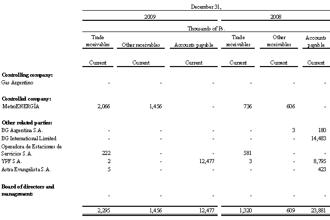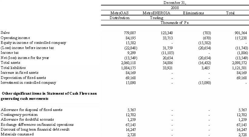 During 2005, due to new rules, (see Note 8.4 to individual accounting statements), MetroGAS' Board decided to constitute MetroENERGIA S.A ("MetroENERGIA"); MetroGAS holds 95% of this corporation's share capital and its social objective is to act as a natural gas trading company and / or a gas transporting company on its own behalf, on third parties behalf or associated to third parties.