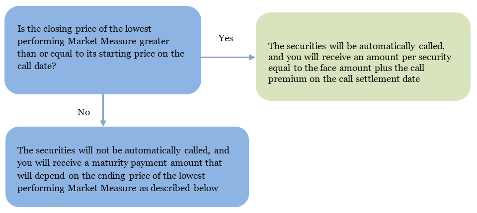 If the closing price of the lowest performing Market Measure on the call date is greater than or equal to its starting price, the securities will be automatically called and, on the call settlement date, you will be entitled to receive a cash payment per security in U.S. dollars equal to the face amount plus the call premium.