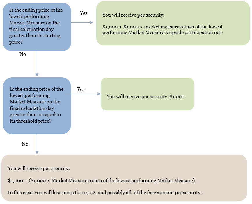 If the ending price of the lowest performing Market Measure is less than its threshold price, you will have full downside exposure to the decrease in the price of the lowest performing Market Measure from its starting price and you will lose more than 50%, and possibly all, of the face amount of your securities