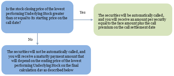 If the stock closing price of the lowest performing Underlying Stock on the call date is greater than or equal to its starting price, the securities will be automatically called and, on the call settlement date, you will be entitled to receive a cash payment per security in U.S. dollars equal to the face amount plus the call premium.