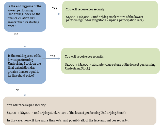 (1)The underlying stock return of the lowest performing Underlying Stock is equal to the percentage change of the lowest performing Underlying Stock from its starting price to its ending price (i.e., the ending price of the lowest performing Underlying Stock on the final calculation day minus its starting price, divided by its starting price).
