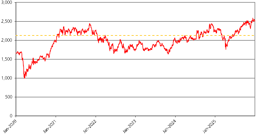 We obtained the information regarding the historical performance of the Reference Asset in the graph below from Bloomberg. The graph below illustrates the performance of the Reference Asset from January 1, 2020 through December 30, 2025. The Closing Value of the Reference Asset on the Trade Date was 2,500.586. The dotted line represents the Barrier Value of 2,125.498, which is equal to 85.00% of the Initial Value.